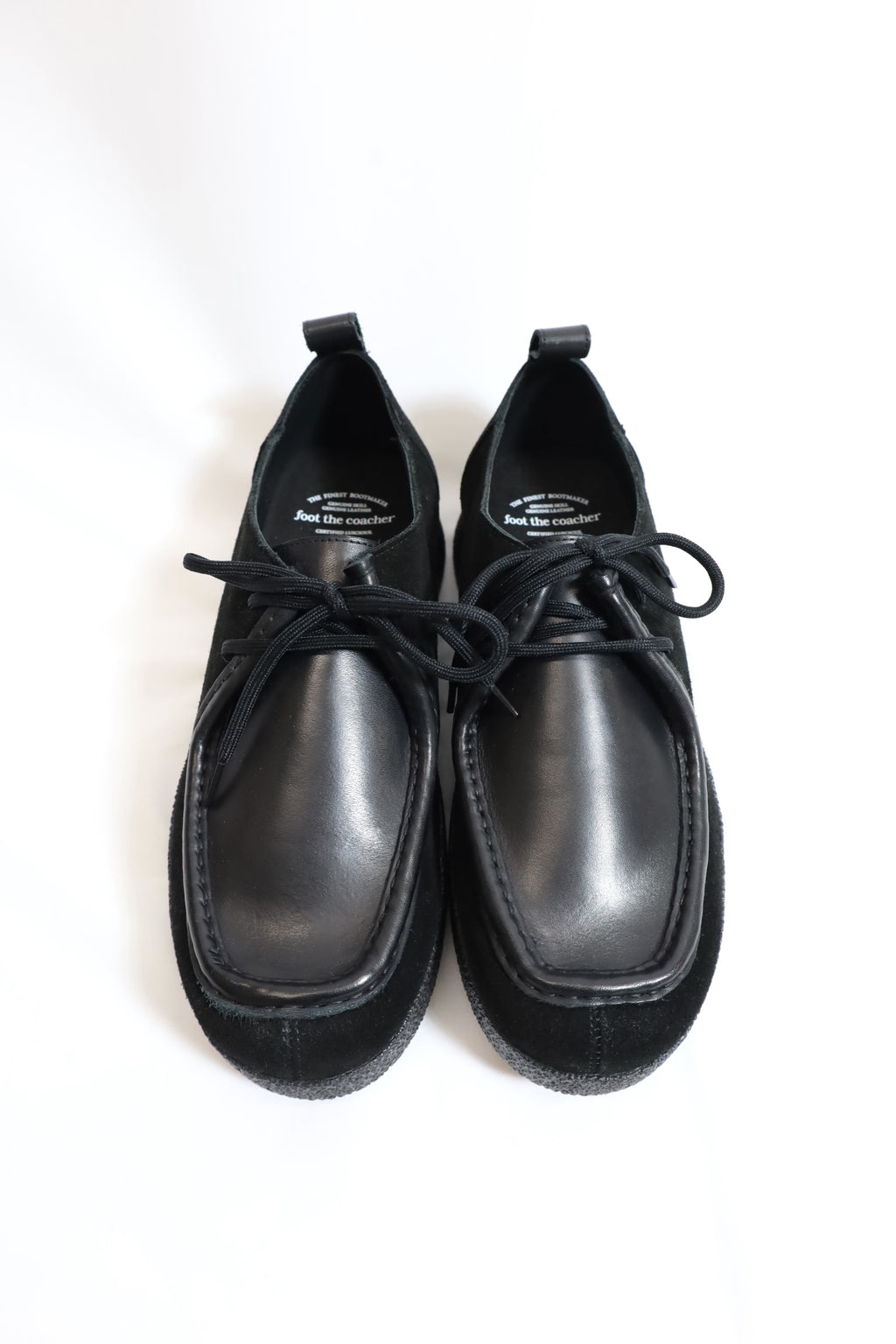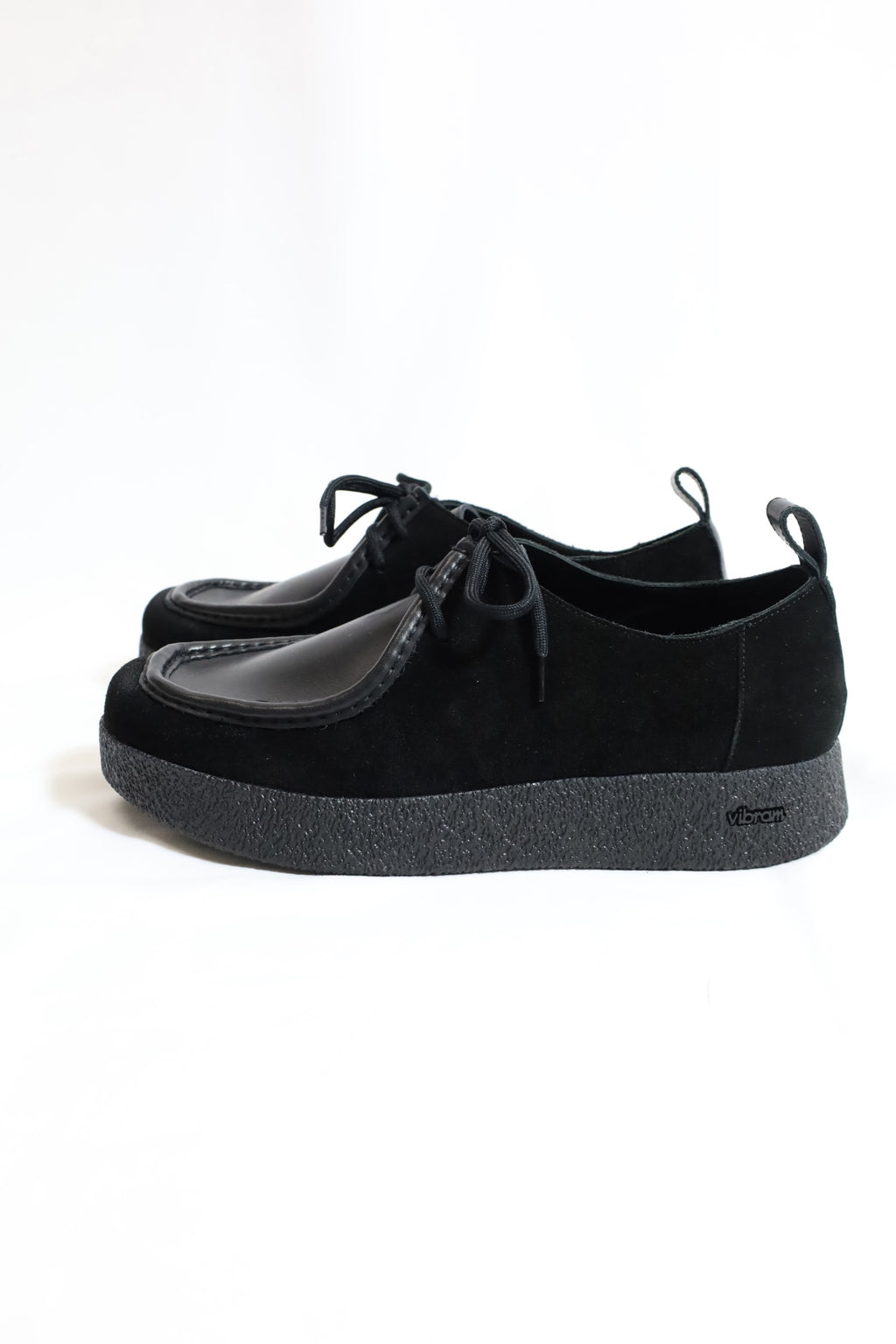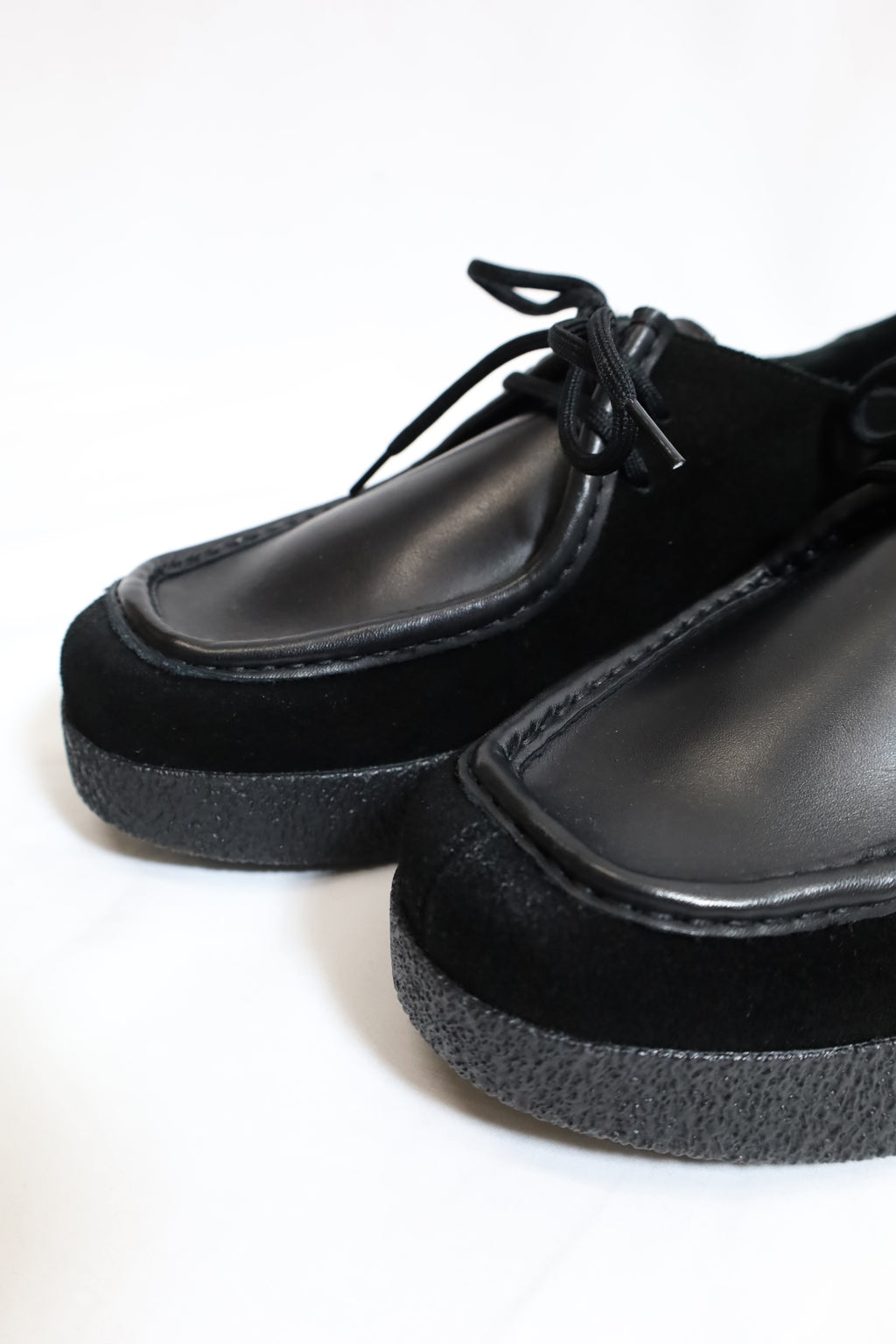古典的なイメージのモカシンシューズを、つま先にボリュームを持たせた特徴的なラストを用いて制作しました。快適な低反発PU素材のクッションインソールと、クレープ柄がリアルに再現された<Vibram®>社製“Crepe”をソールに採用。このソールは、内側に発砲ウレタンを使用することによって軽量化され、クッション性が向上している点が特徴です。