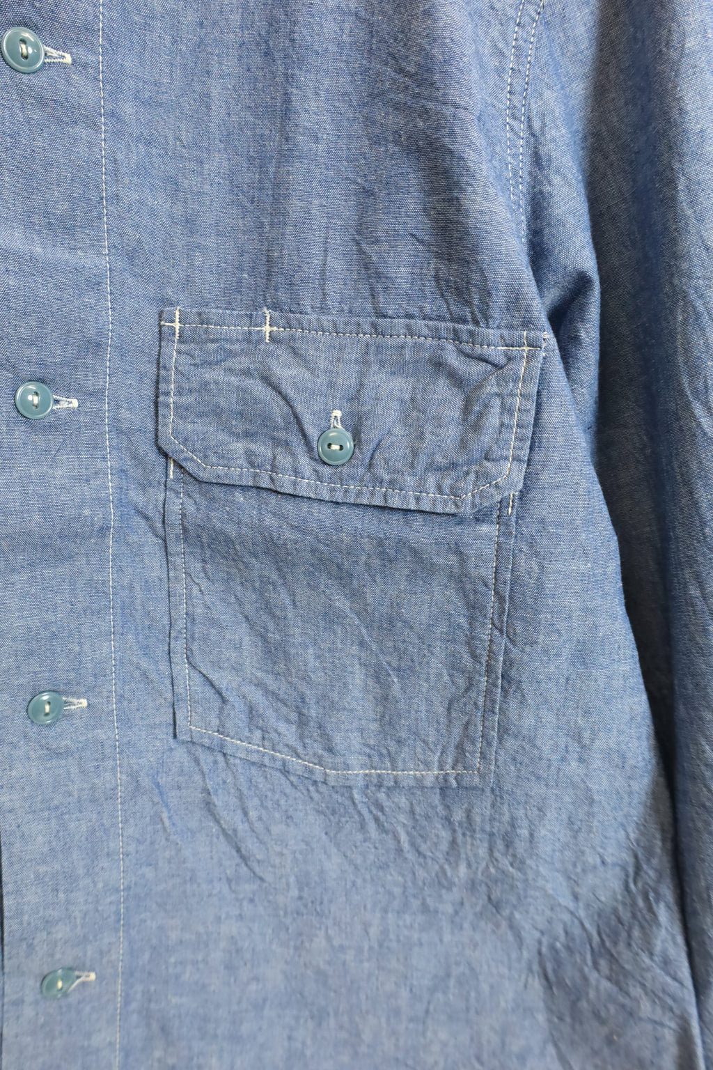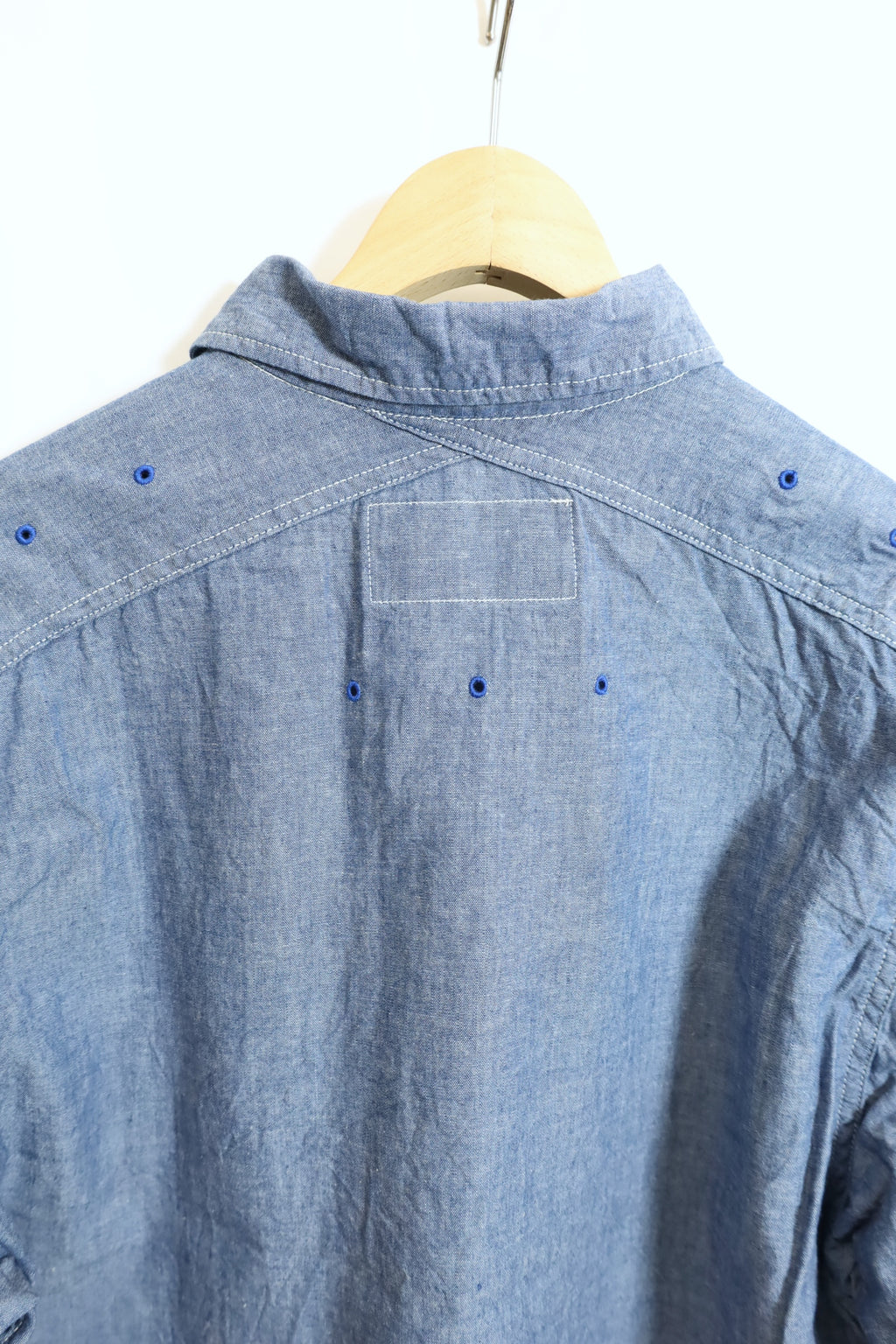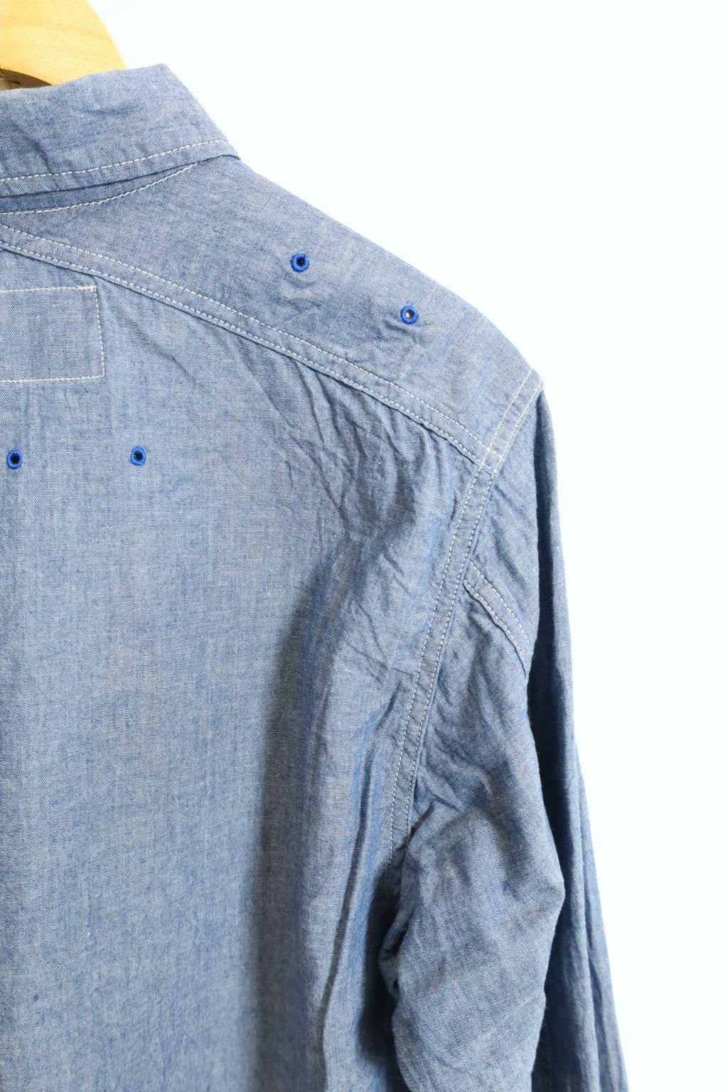 CORONA製。 このシャツは、ミリタリーフィールドシャツを基にしたもので、 前身頃から後身頃にかけて肩をおおうように被さるヨークは背中部分でクロスする独特なデザインが特徴です。 シャツ全体に菊穴が計15個入っていて、ポップなアクセントとなっています。