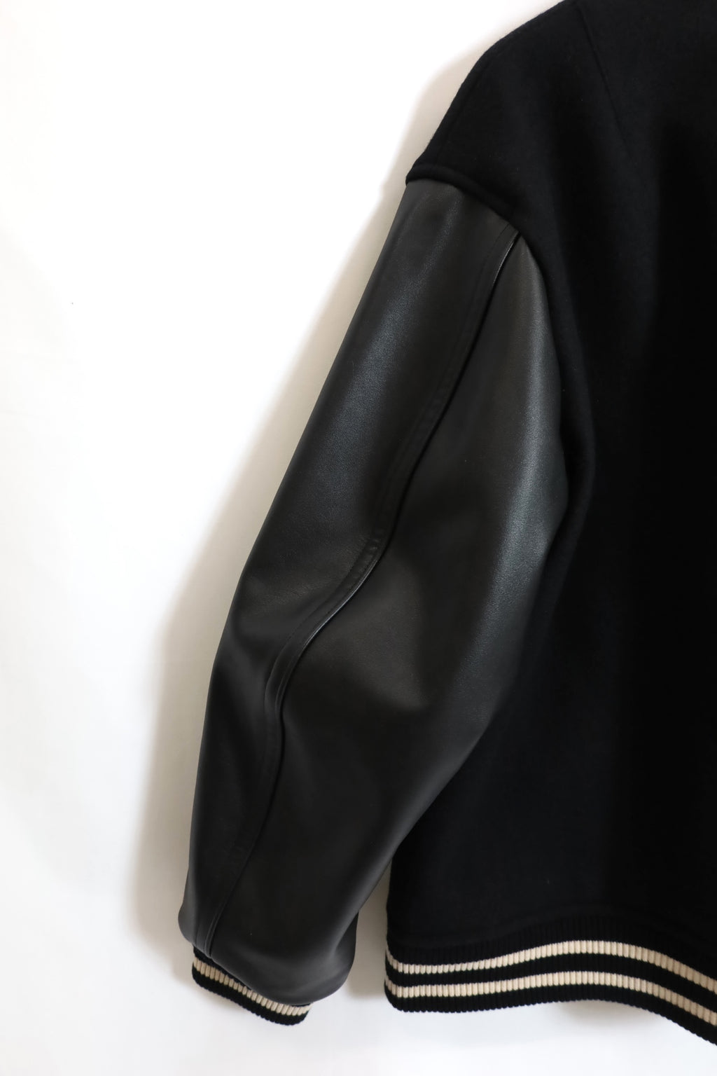 レザー部分もスムースにライトオンスのため軽く、ウールリブにライン入りとクラシックな仕様。