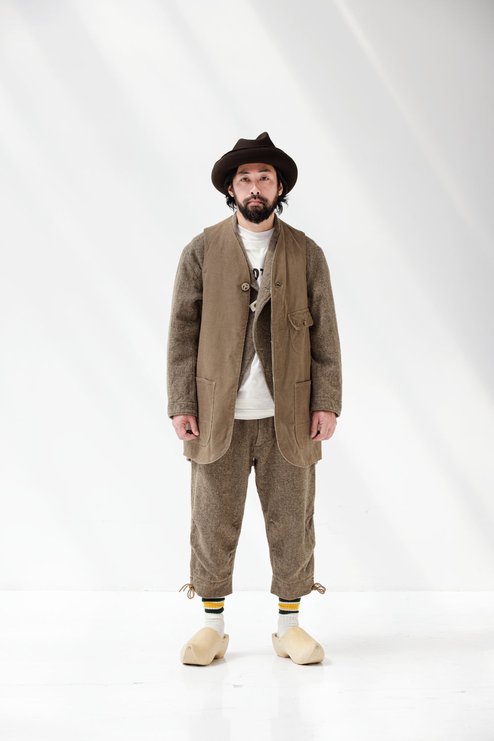 ベストはロング丈 with 広いアームホール、つまりジャケット・オンで着ても良しのオーバーベストとして使うべくのストーリーを描いた一作。トップボタン一個掛けのフロントはその真骨頂となるべくのディティールにしてこだわり。ボリュームがあるトップスに重ねた時にこそ発揮される裾広がりのAラインシルエットは見どころ。フロント&バックのポケットに加え、内側の胴回りをぐるりと回るゲームポケットで収納も抜群。着るカバン aka Luggage Wearとしてお役立ち必至。こちらは2素材展開のコットンコーデュロイ版。