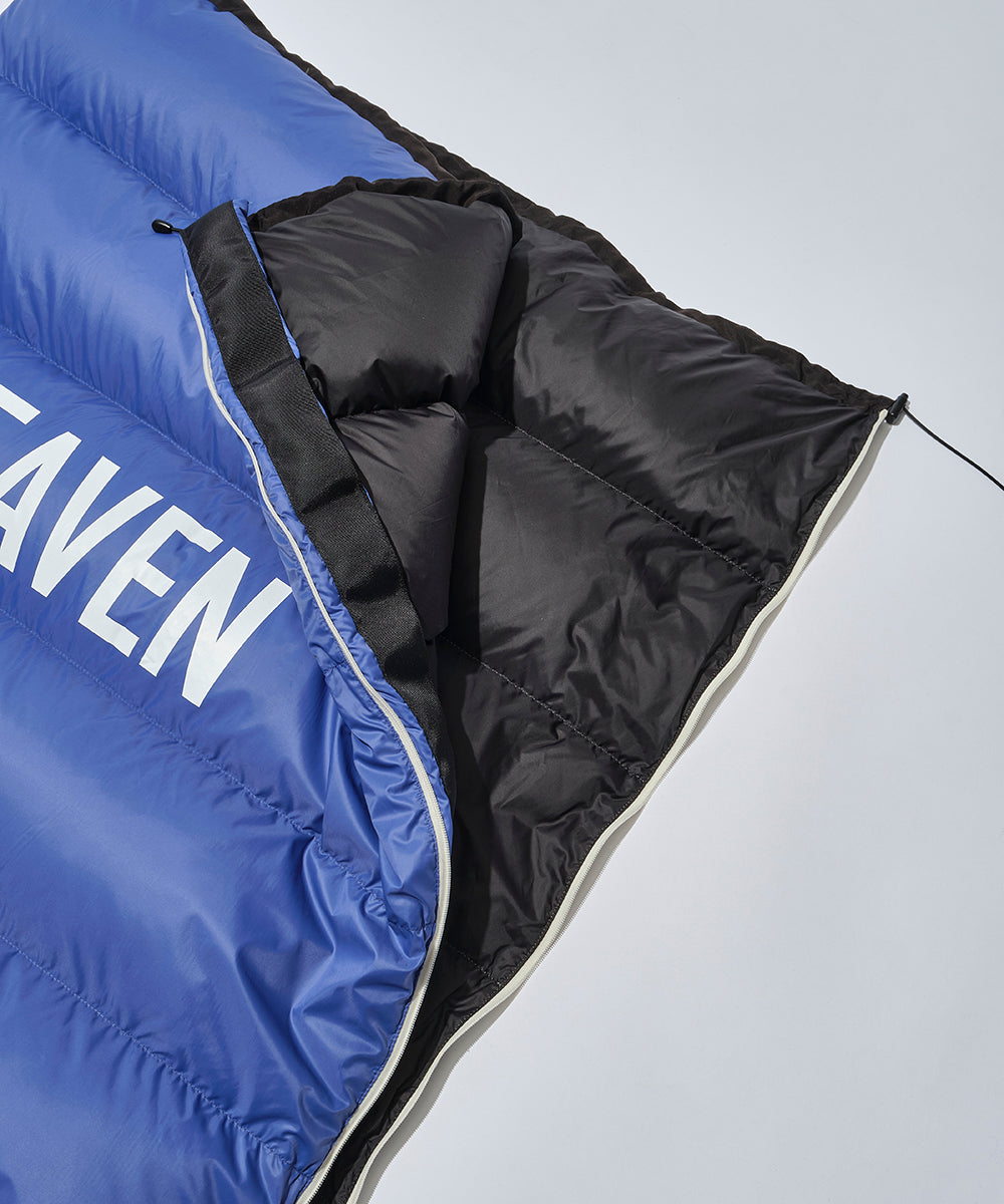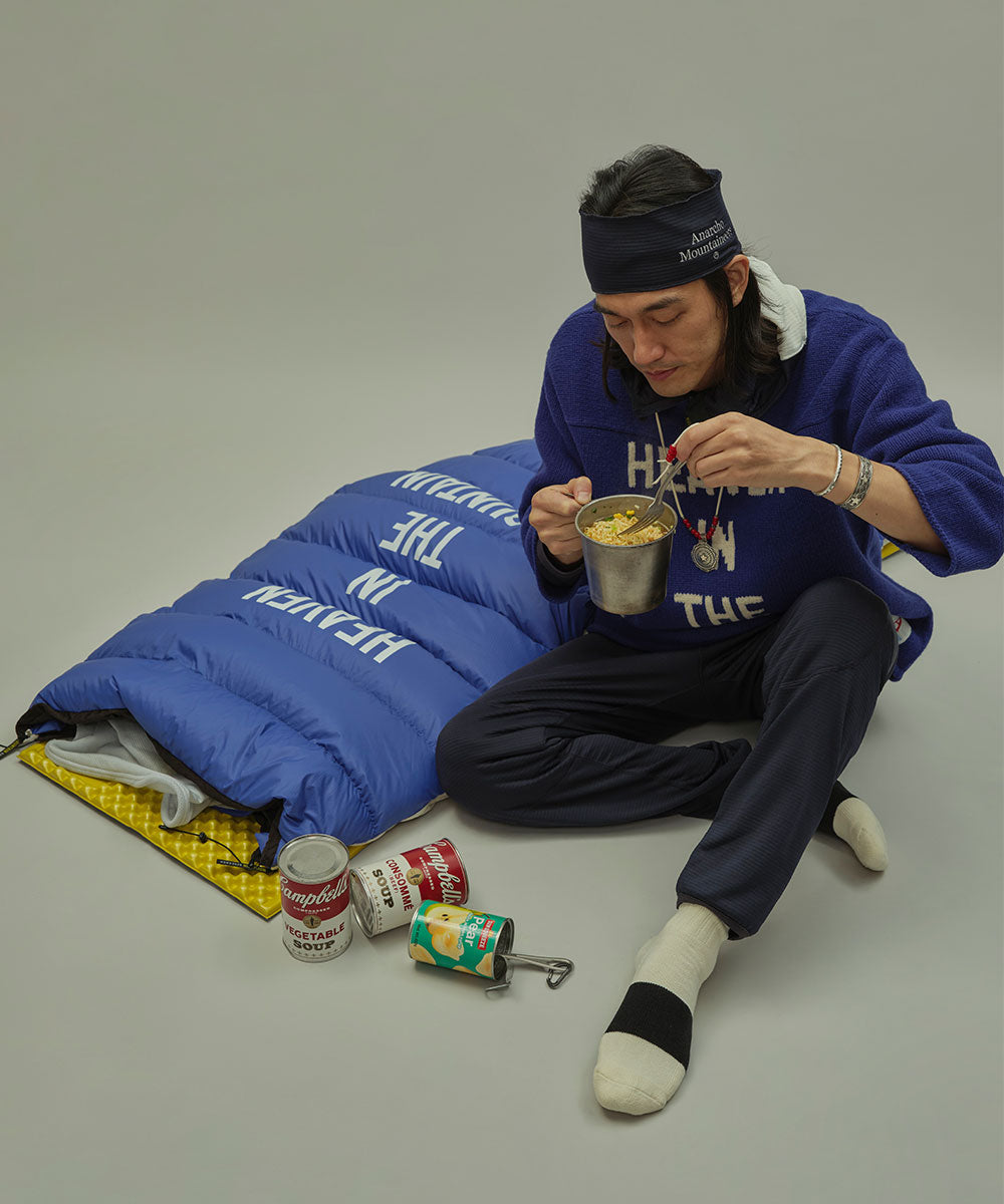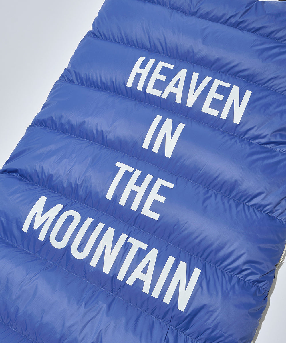 ダウンウェアブランドTAION社とのコラボレーション作となる筒型フォルムのスリーピングバッグは、サイドファスナー開口で腕、ドローコード調整で足を出すことができる”着たまま行動”対応型。ダウンは前出のジャケット・ベストと同様に800フィルパワーのホワイトダック。スムースかつ軽量なリサイクルナイロンのボディの前後は配色になっていて、ブルーの面にはシーズンのキーワードの1つ、”HEAVEN IN THE MOUNTAIN”、ホワイトの面にはH.I.T.M.プリント入り