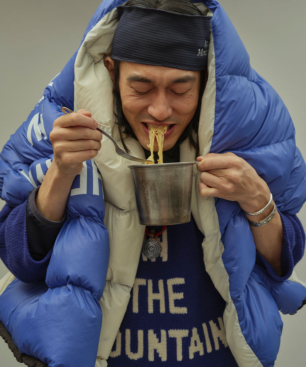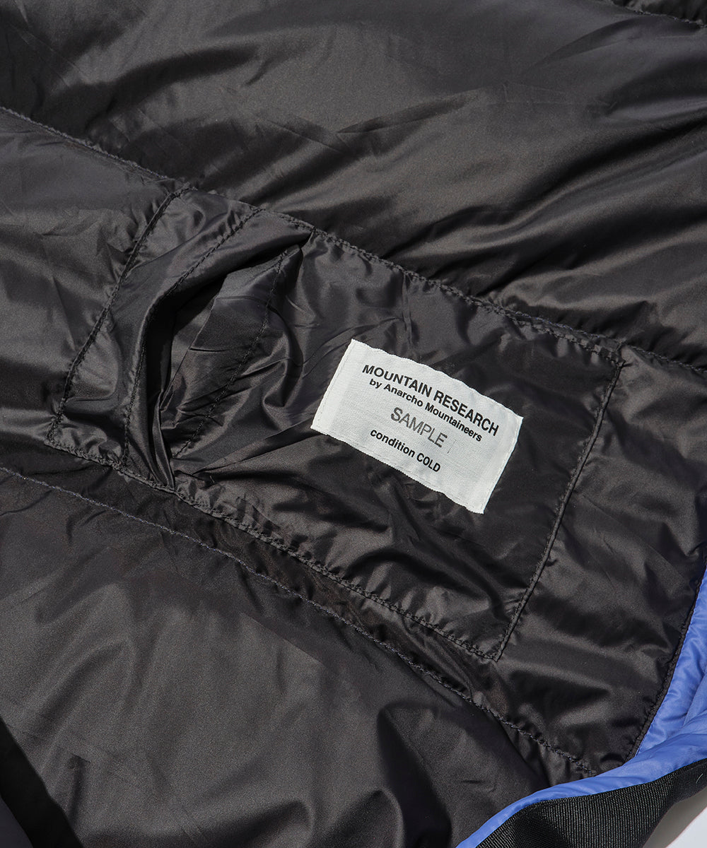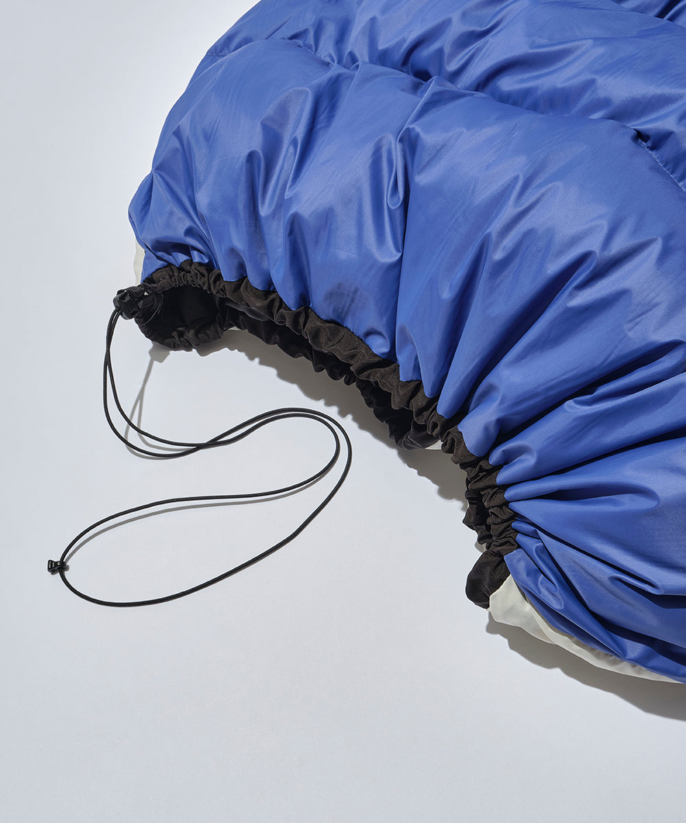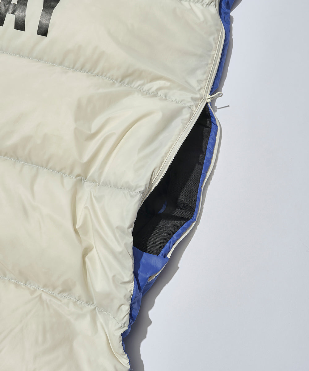 ダウンウェアブランドTAION社とのコラボレーション作となる筒型フォルムのスリーピングバッグは、サイドファスナー開口で腕、ドローコード調整で足を出すことができる”着たまま行動”対応型。ダウンは前出のジャケット・ベストと同様に800フィルパワーのホワイトダック。スムースかつ軽量なリサイクルナイロンのボディの前後は配色になっていて、ブルーの面にはシーズンのキーワードの1つ、”HEAVEN IN THE MOUNTAIN”、ホワイトの面にはH.I.T.M.プリント入り