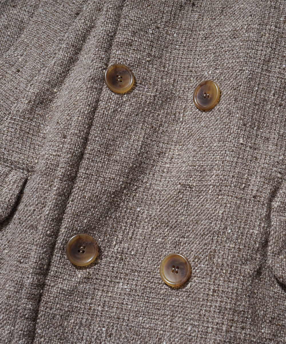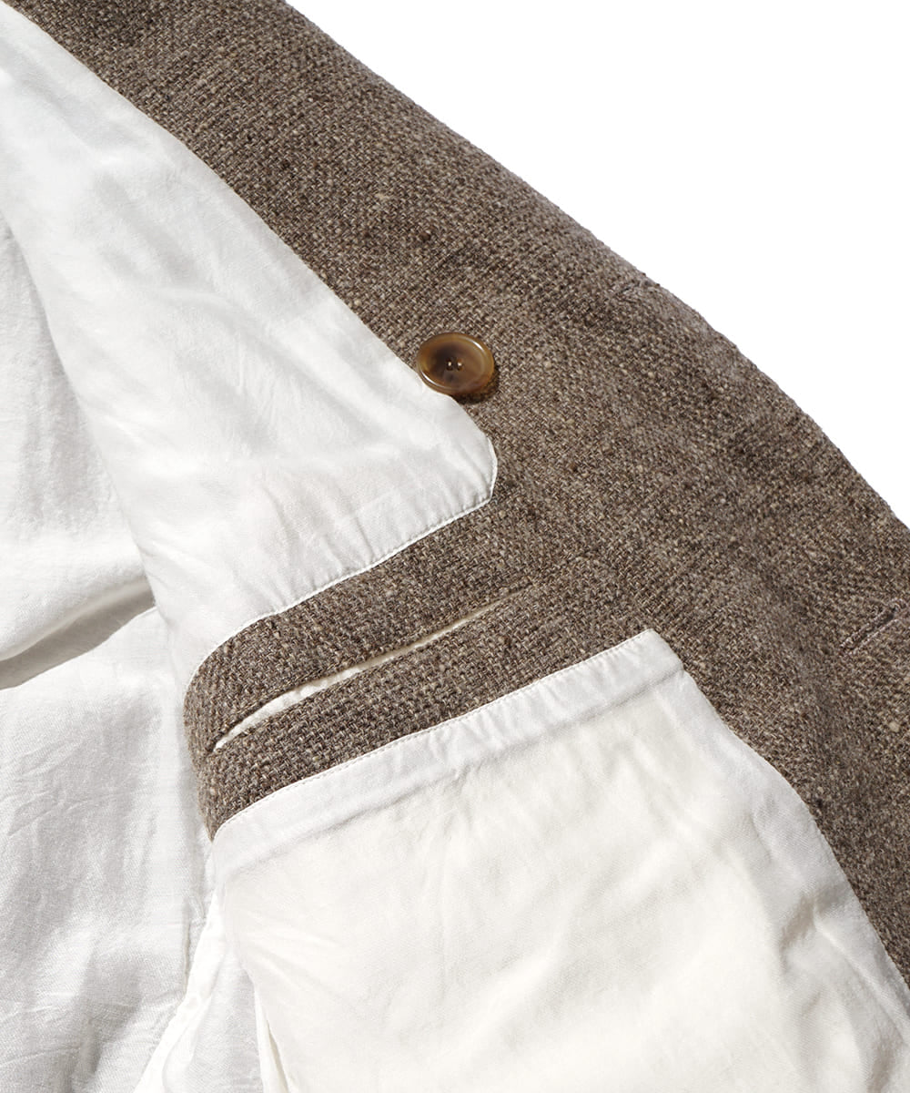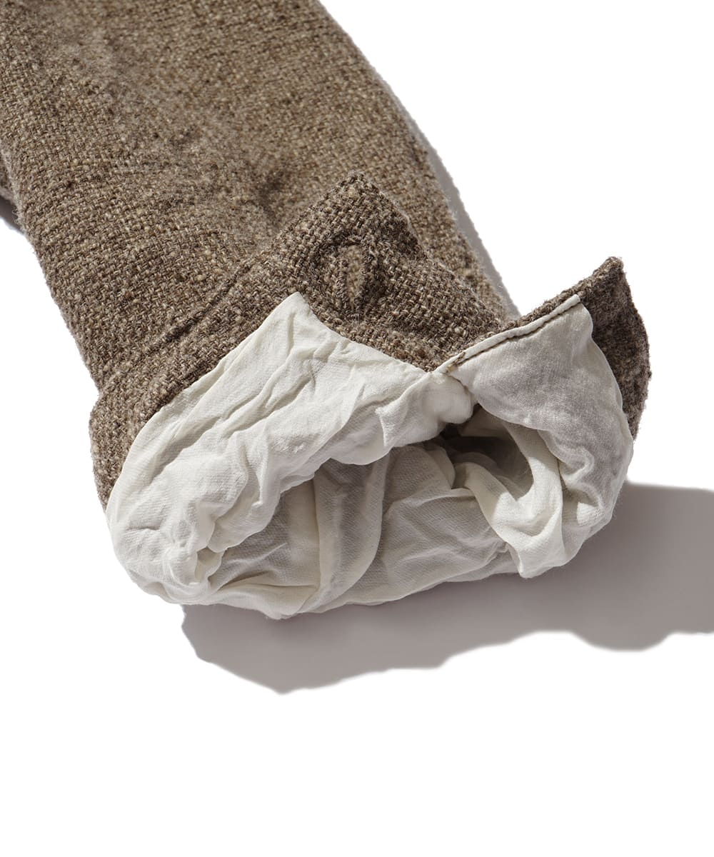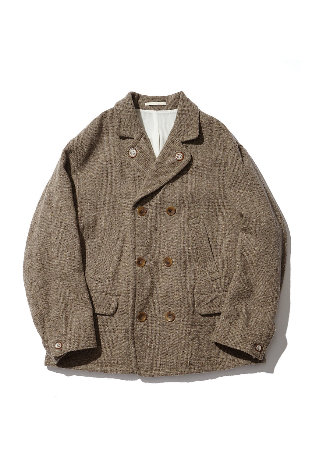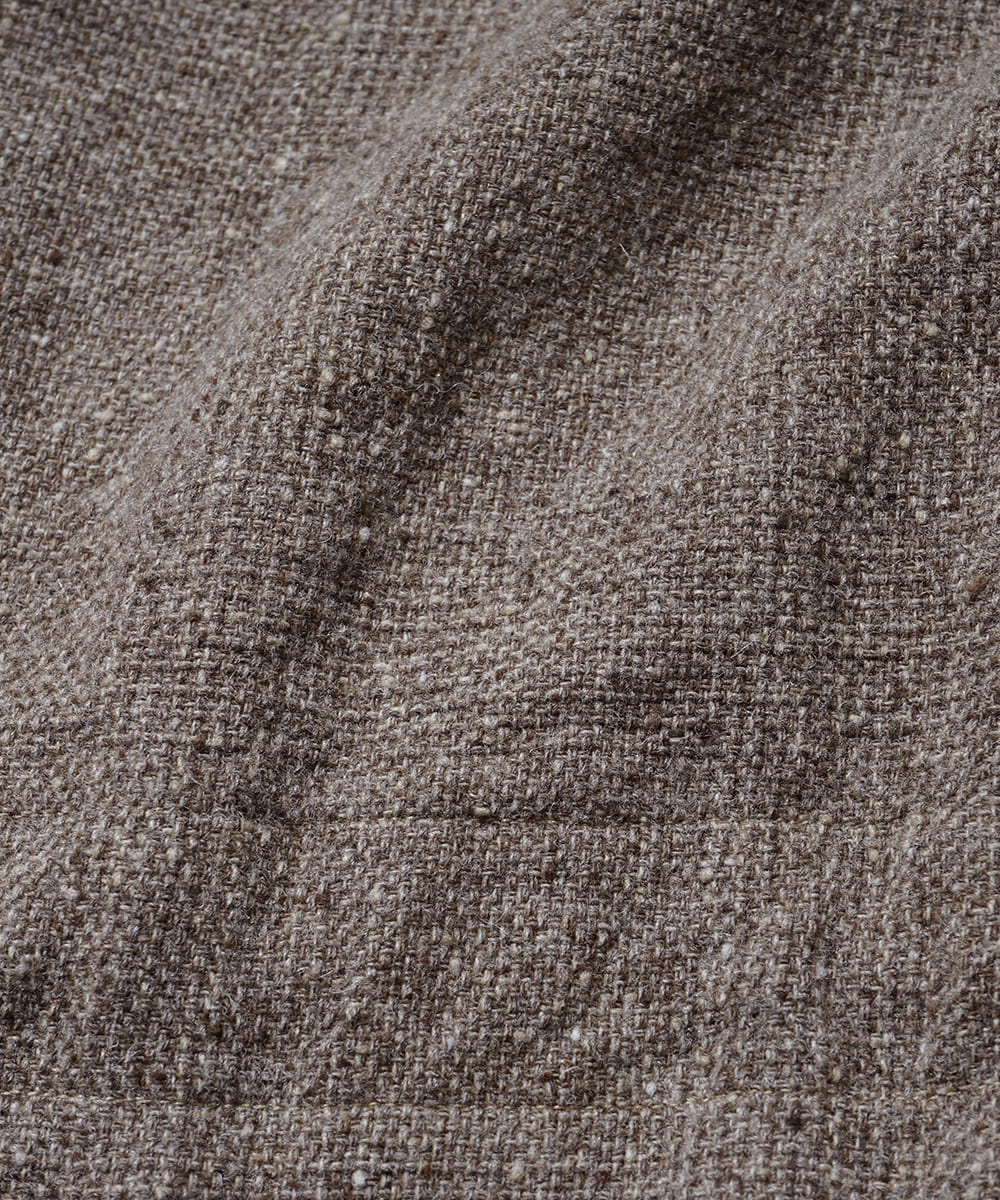 チロル地方の伝統的な山岳衣装をメイクオーバーしたジャケットは、ややショートの丈とダブルブレスト・フロントが醸すバランスが絶妙なマッチング。本作では、MTR4221と同様に背中のギャザーをフィーチャー。ドローコードを絞ることで存分なシルエット可変を楽しめるハズ。ラペルトップには元祖チロリアンに習うM.F.T.シンボリックな飴色ボタンをツイン配置。素材は前述のジャケットと同じツイード。