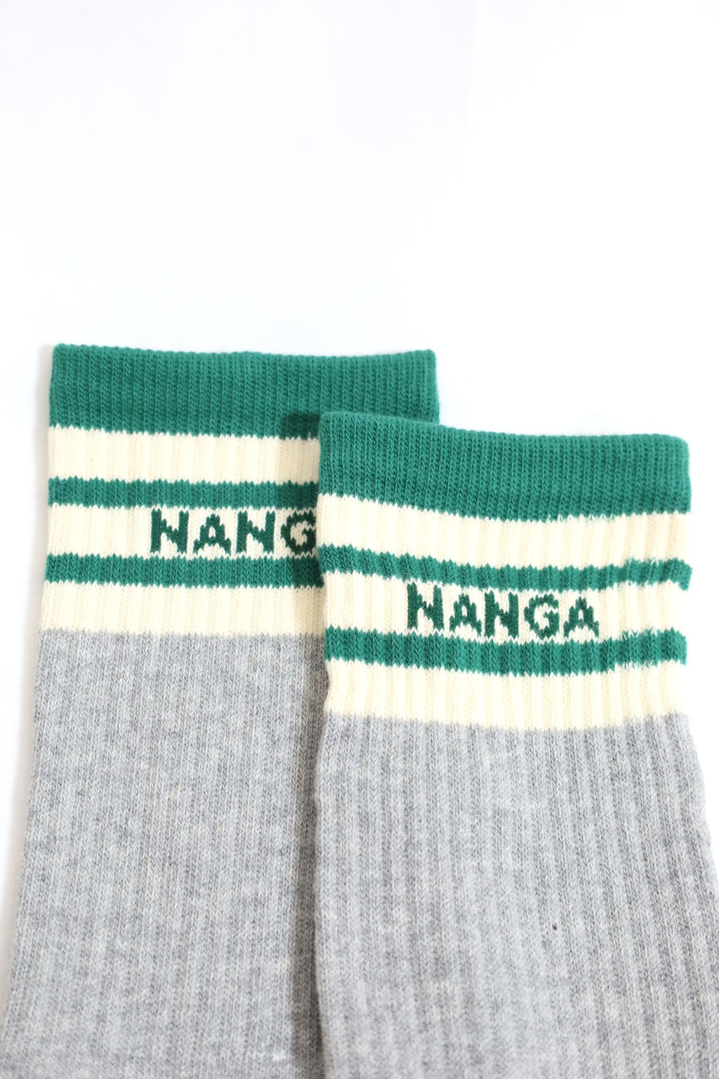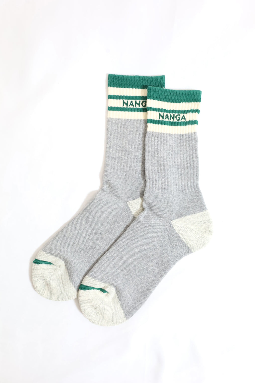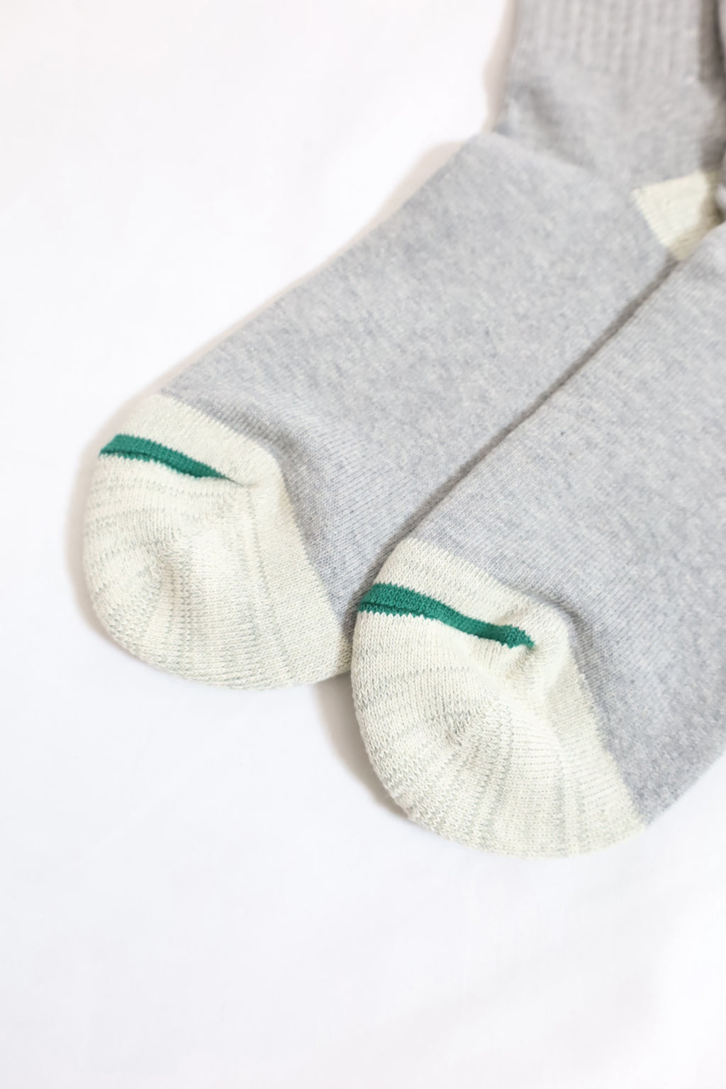 ‧メランジグレーのボディ本体に履き⼝にカラー配⾊のラインとロゴを⼊れたライン⼊りソックス。