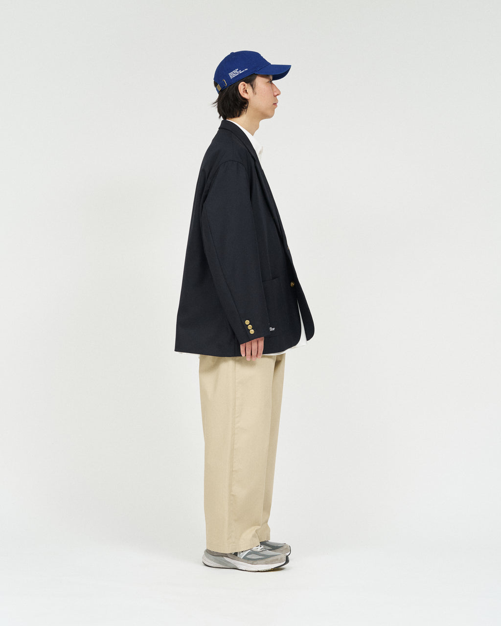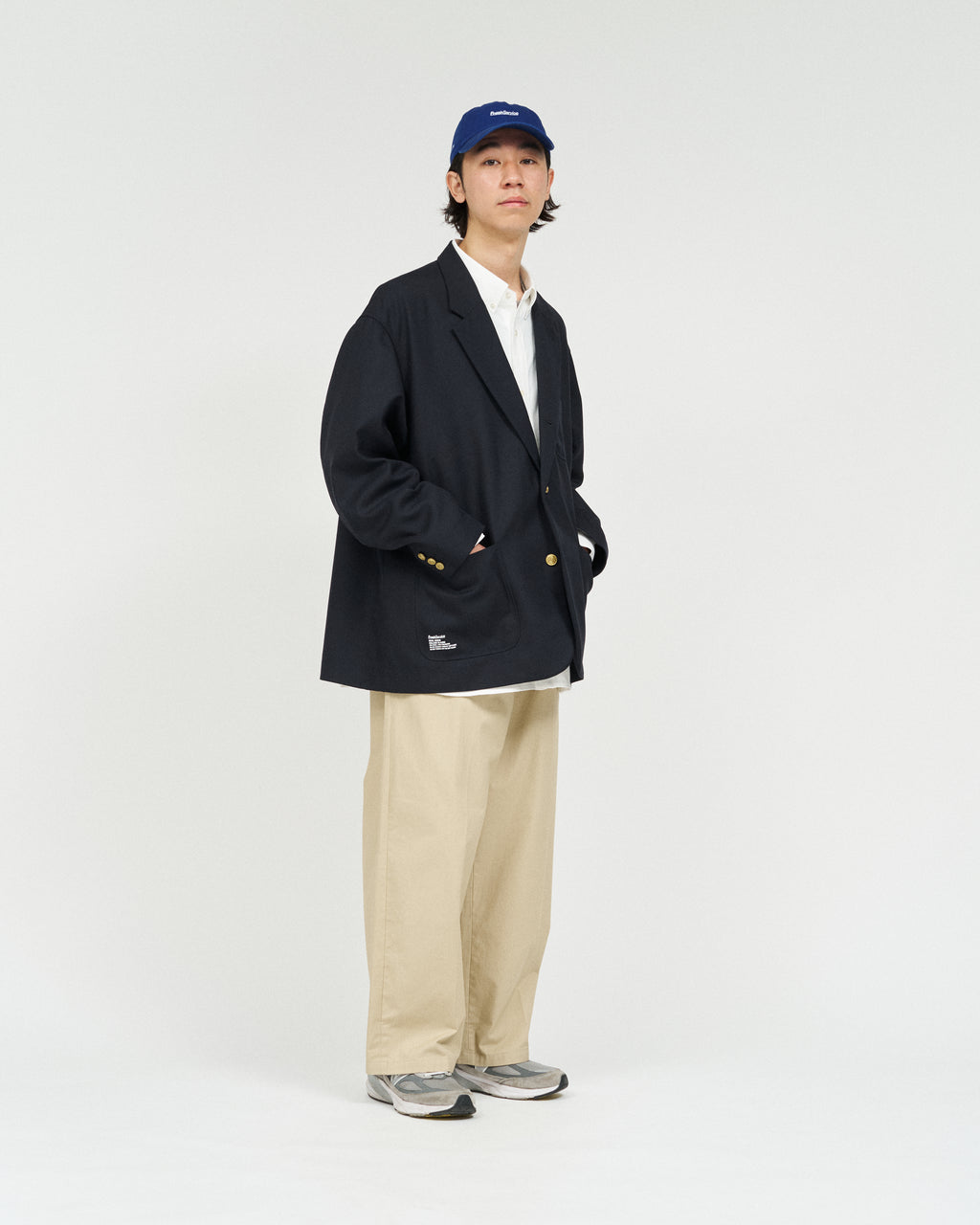ブレザーに相性の良いチノトラウザーをベースに、FreshService らしくゆったりしたサイジングでモダナイズ。