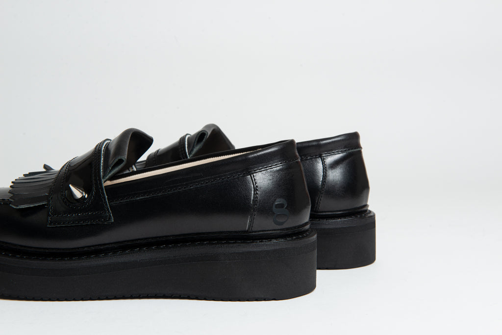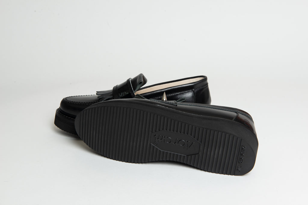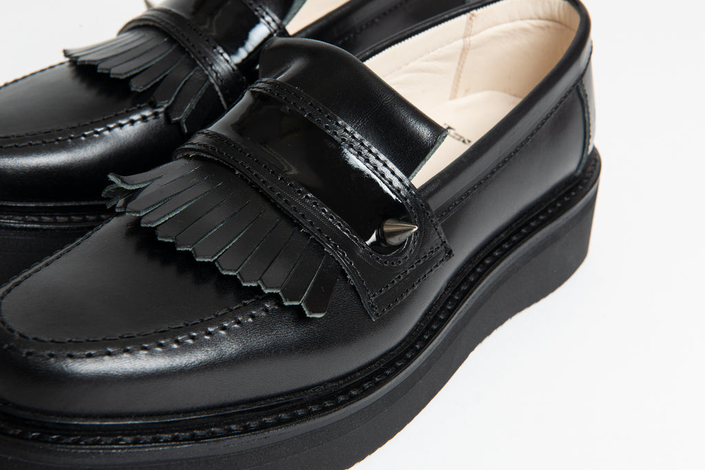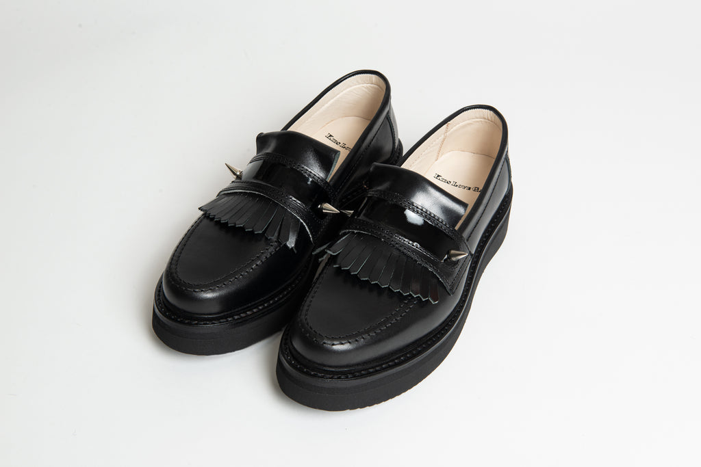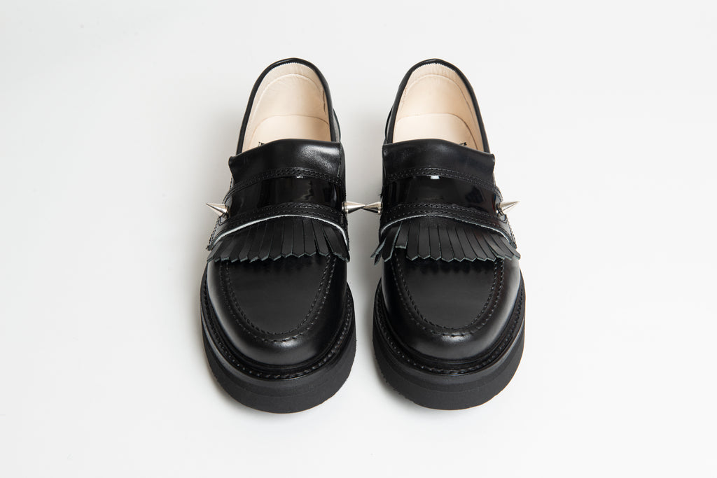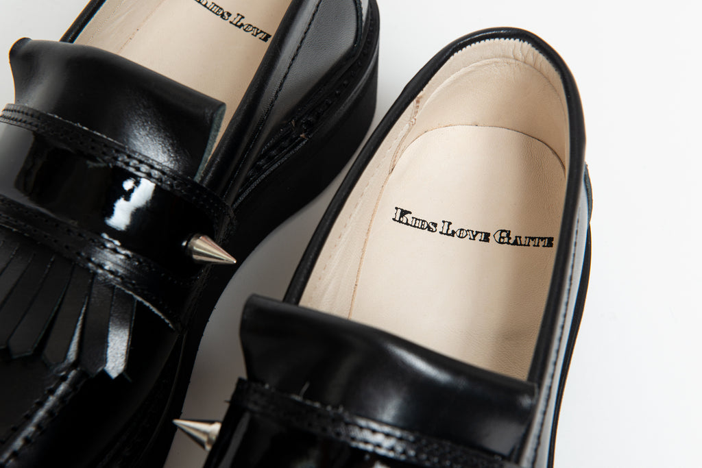 両端をコーンスタッズで留め上げたキルトローファー。反骨精神が上品に添えられた美しい一足。