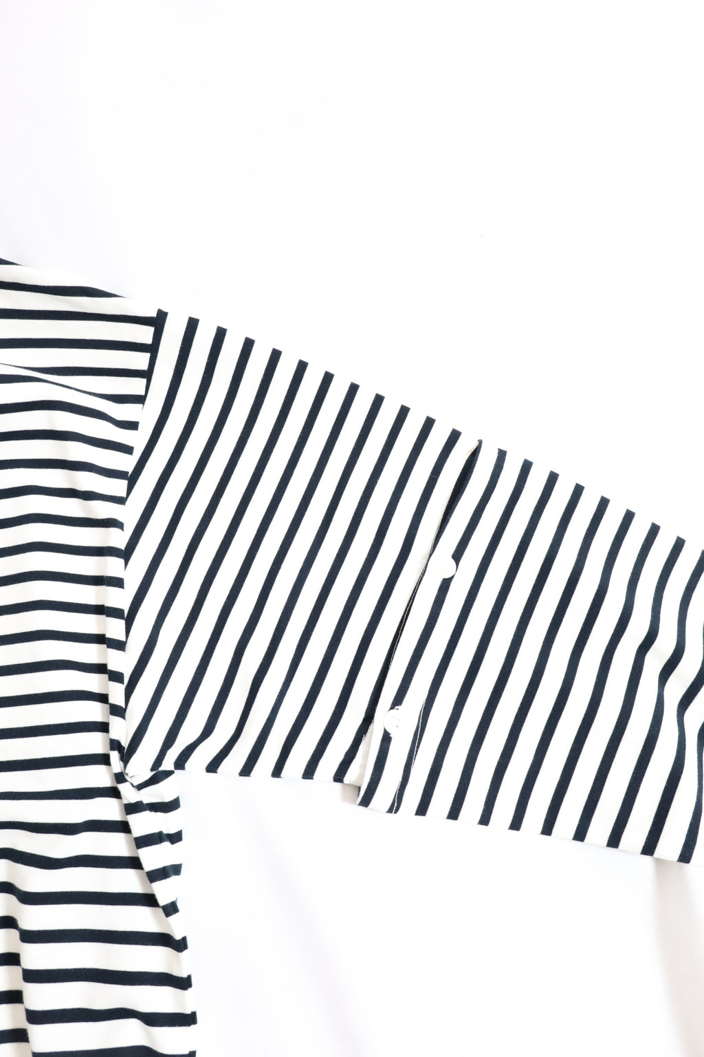 単なるボーダーTシャツに留まらず、ボタン仕様のスリーブによってシルエットや表情に変化を加えることが可能。完全に取り外すだけでなく、部分的に開閉することで軽やかなニュアンスを演出します。スタイリングによって変化を楽しめる、可変性を持ったボーダーTシャツ。