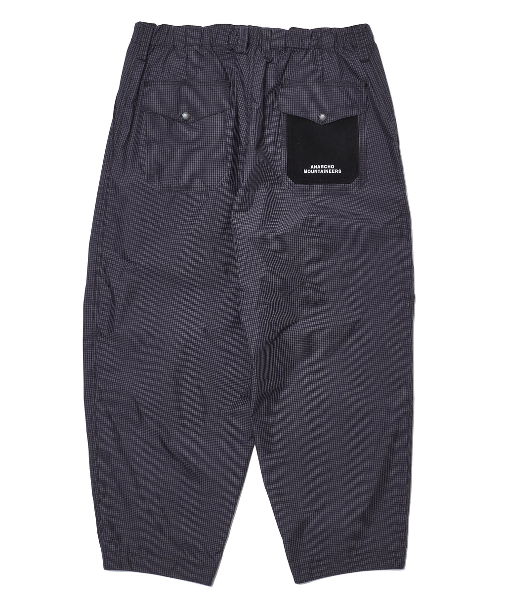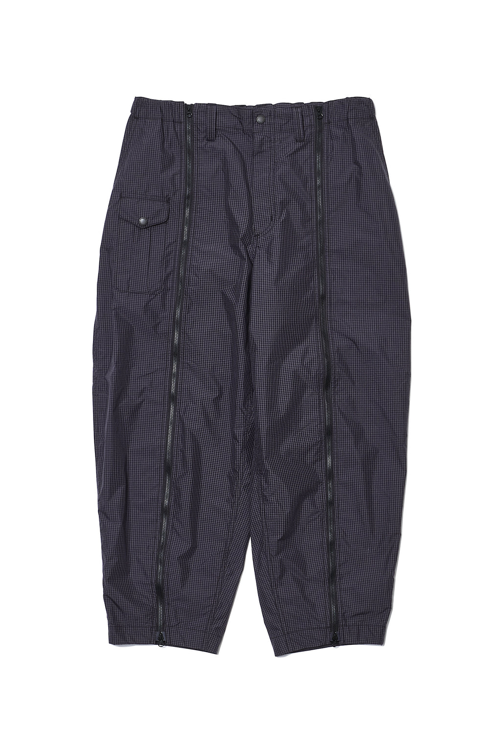 U.S. Army Air Forces(UAAAF)のA-11トラウザーズに着想を得たワイドパンツ。両脚に配されたオープンファスナーが最大の特徴で、デザインのアクセントにもなっています。素材には、白のグリッドパターンが印象的なナイロンコットンタイプライタークロスを採用。シルエットは、ゆったりとしたワイドテーパードの9分丈で、存在感のある一本に仕上がっています。○+α featuresA.M.プリント入りのフェイクレザーポケット