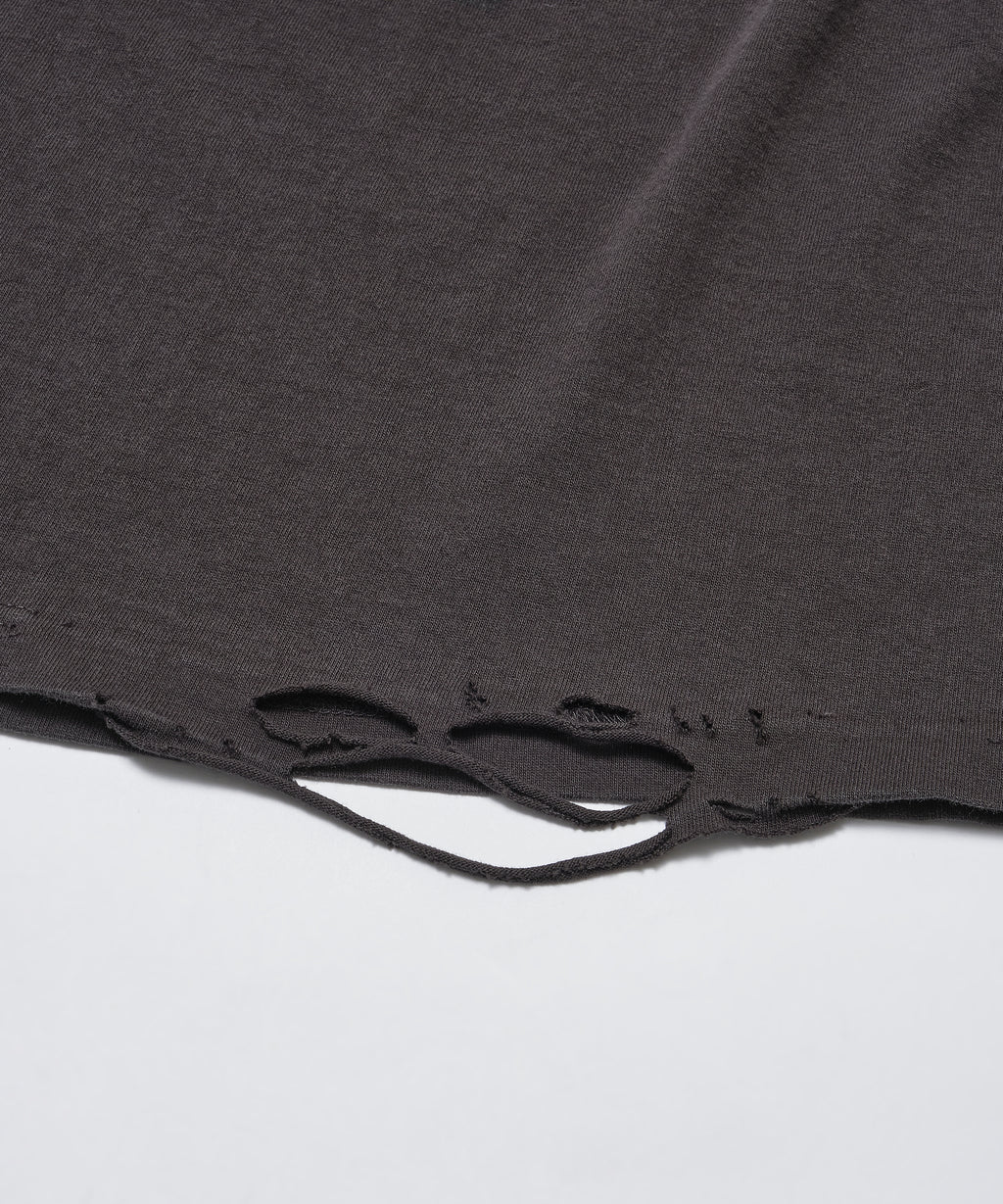 ダメージ加工のプリントTシャツ。コットン100%素材のボディに職人の手作業によるダメージ加工が施されています。プリントは、シーズンテーマに深い関わりを持つお二人。ブランドフィロソフィーの師と仰ぐヘンリー・D・ソロー、インド独立の父として知られるマハトマ・ガンディーです。