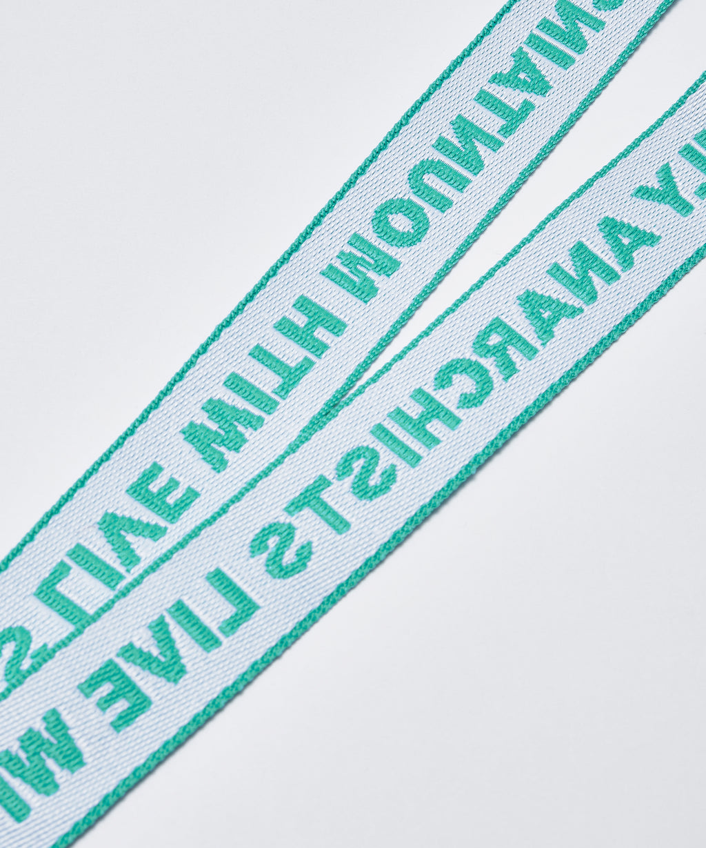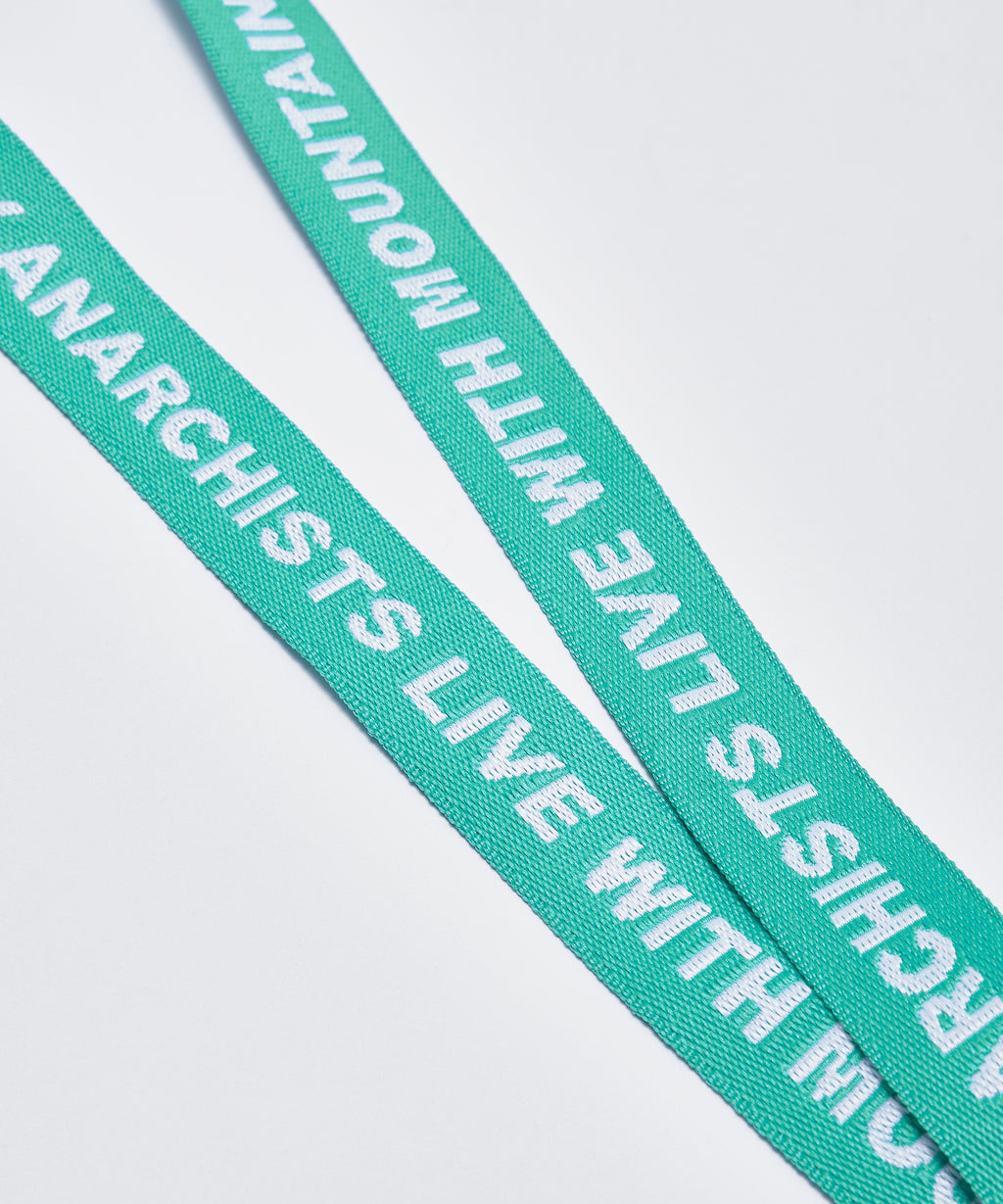 ”Only Anarchists live with Mountains”のジャガード織テープのネックストラップ。首から掛けても、ポーチに繋げても。○+α featuresMTR4308 / Rivet Pouchと連動での使用を推奨