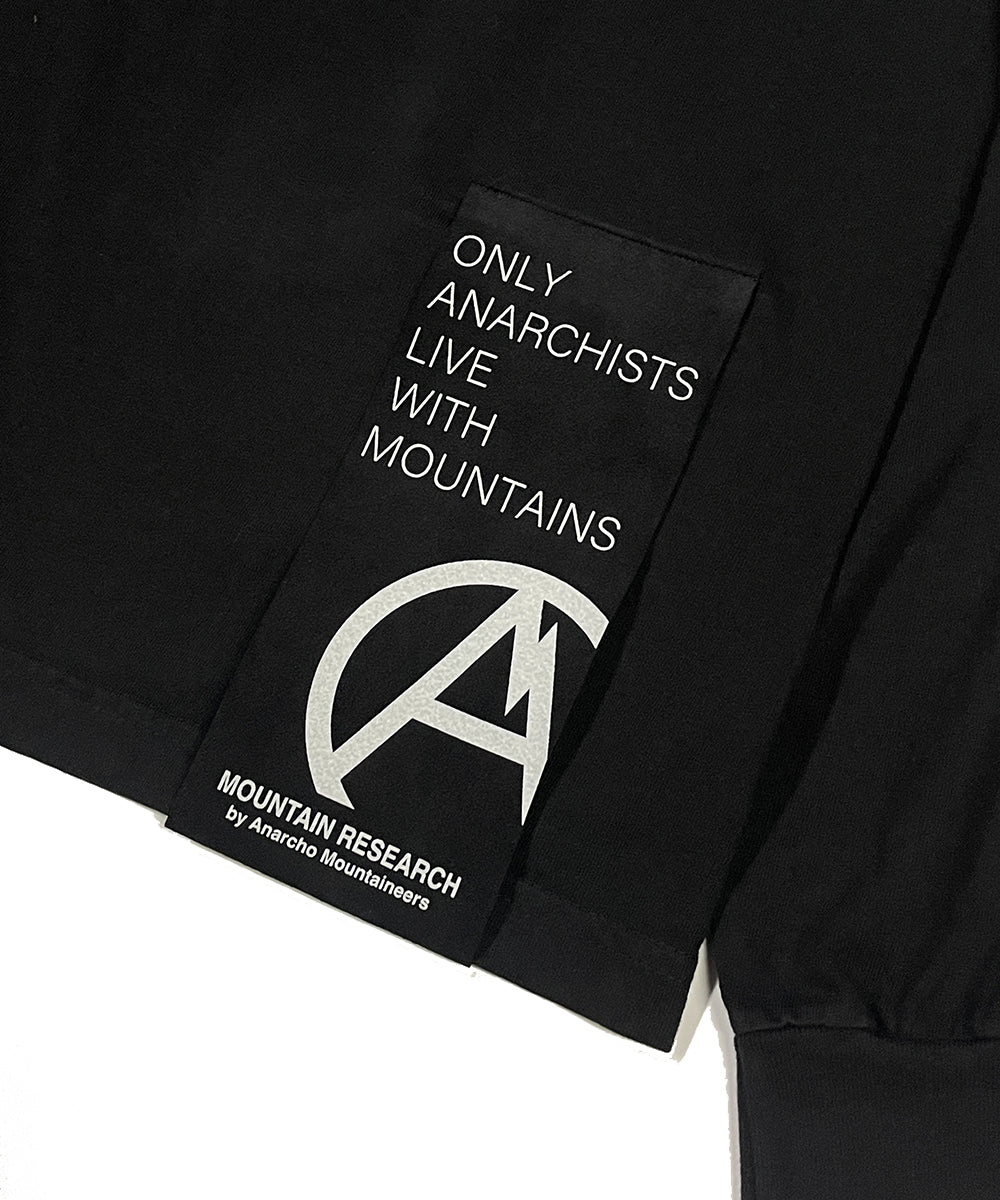 フェイクレザー製の巨大タグ、通称「メガタグ」を裾に縫いつけたコットン素材のロングスリーブTシャツ。2025年の新作では、Made in USAの丸胴ボディでお馴染みの《MINE》製Tシャツをベースに採用しています。メガタグの内側には、カードなどの収納に便利なスタッシュポケット付き。○+α features“ONLY ANARCHIST LIVE WITH MOUNTAINS”バックプリント