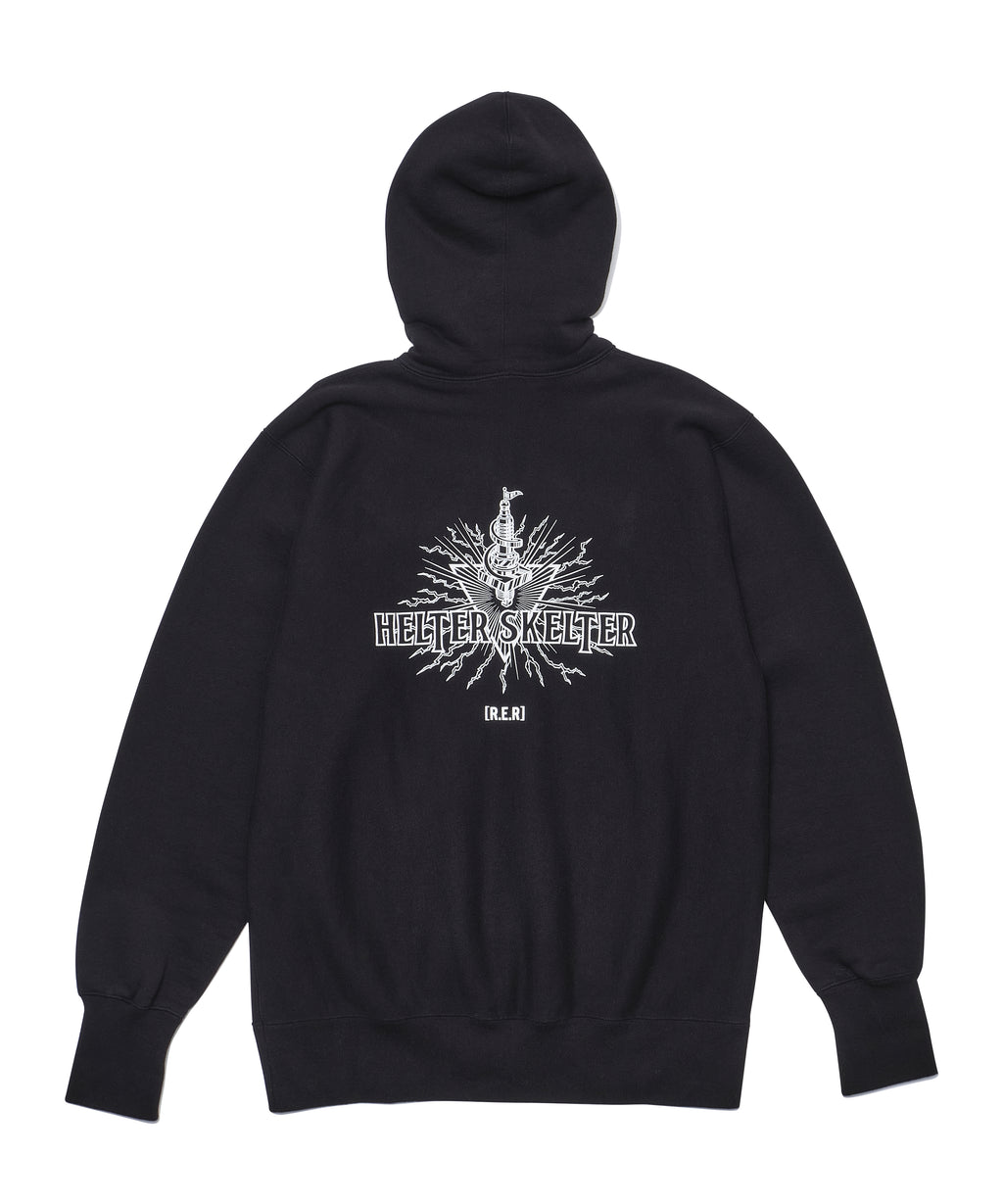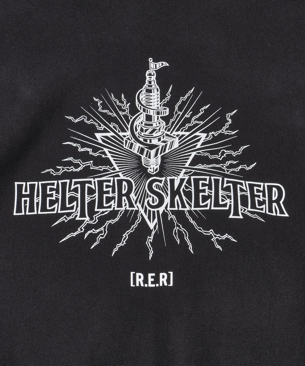 迫力あるバックプリントは、スパークしたバイクの点火プラグをモチーフに、英国の螺旋式大型滑り台(通称:HELTER SKELTER)のイメージを重ねてデザインされた描き下ろしのグラフィックとなっています。