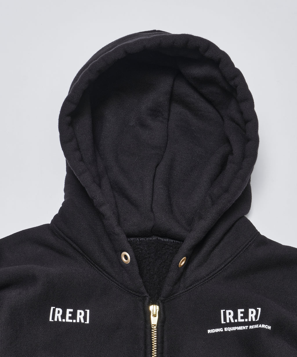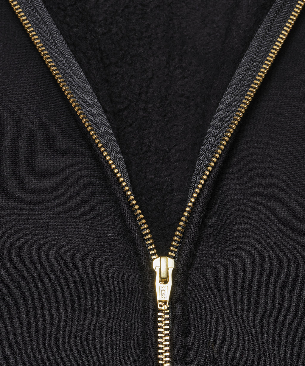 裏起毛仕様のウォーム感あふれるスエット生地は、同シリーズのクルーネックやガレージパンツと同じく、重厚な素材感を感じる1着。風の侵入を防ぐ丸編みのロングリブや、厚みがあり柔らかい風合いのボディは正にビンテージスエットそのもの。ボリューム感に拘ったフードの作りも必見。