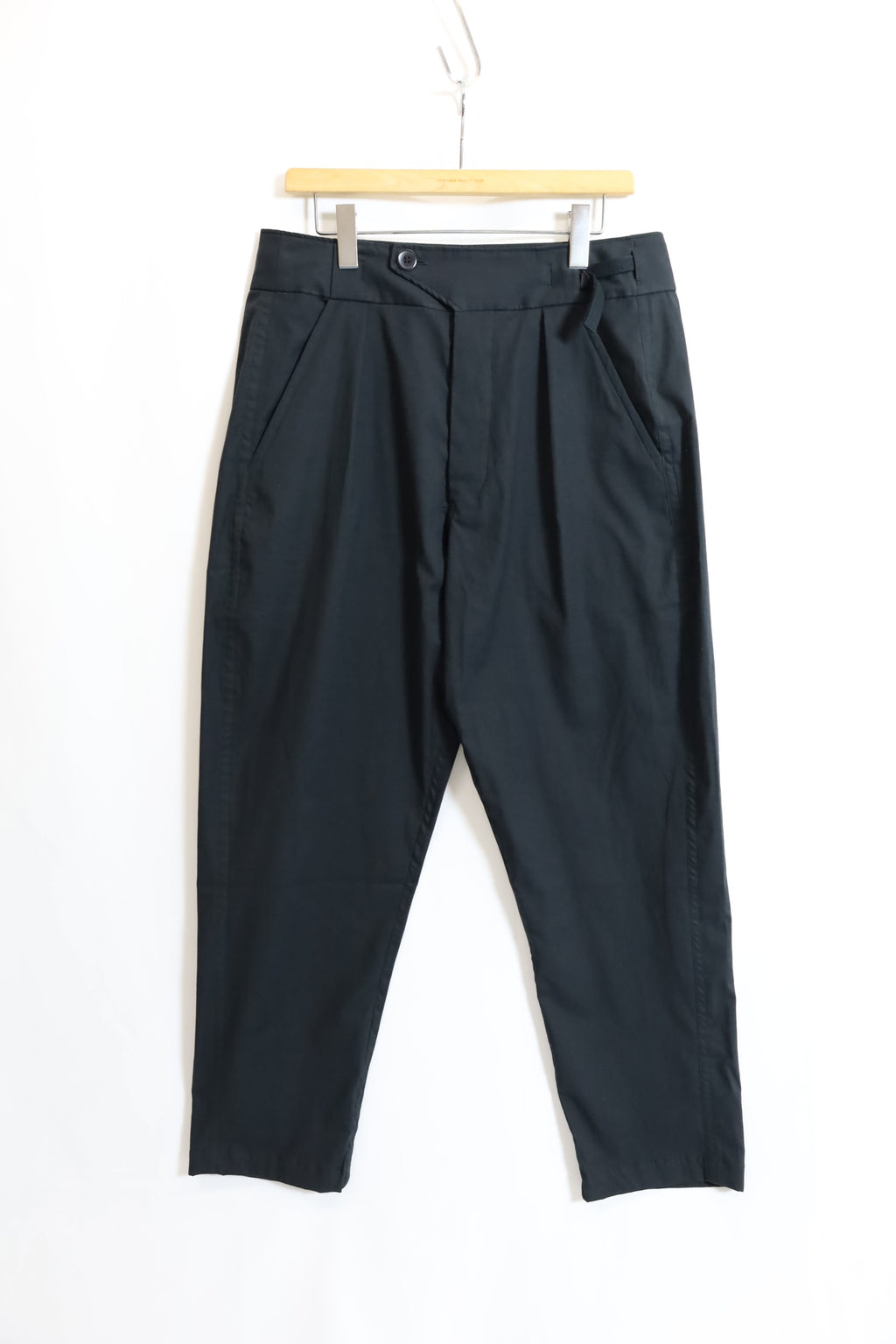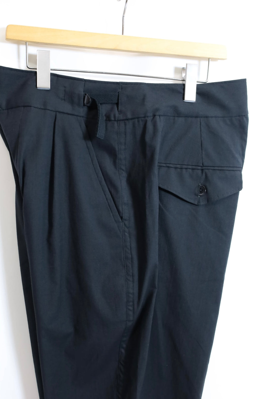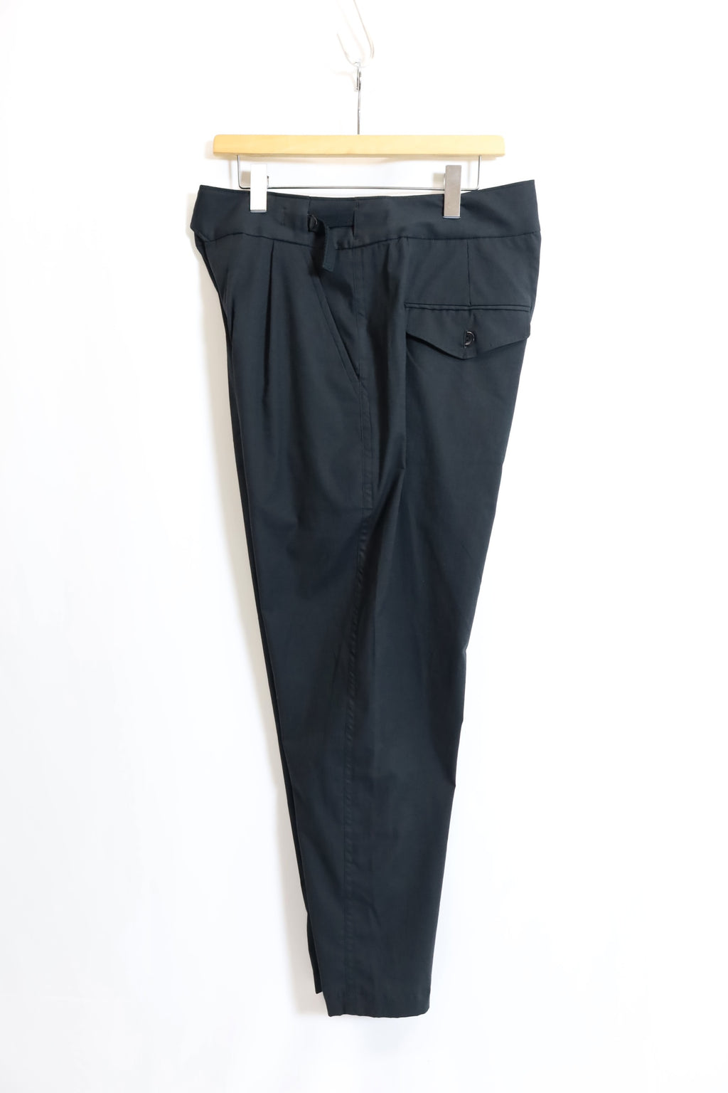 ウエストサイズを微調整できる サイドアジャスター。フロントはタックが入り 少し深めの股上で腰回りにゆとりがあり 膝から裾に向かいテーパードが入ったパンツです。
